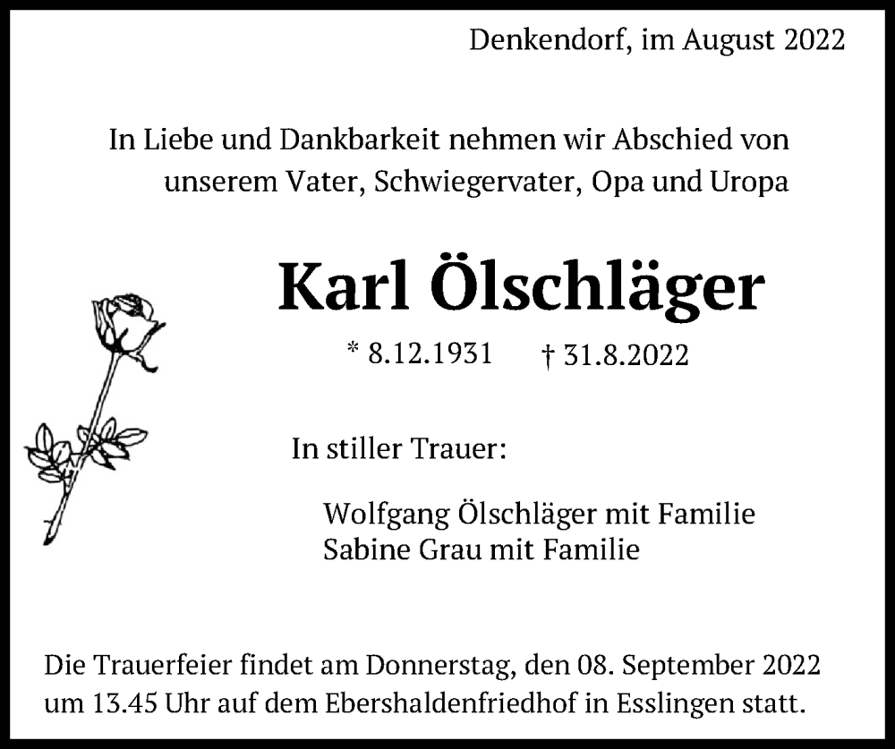 Hier finden Sie alle Traueranzeigen aus der Zeitung, die bisher für Karl Ölschläger erschienen sind. Weitere Traueranzeigen, die in der Zeitung erscheinen, werden hier ebenfalls aufgelistet