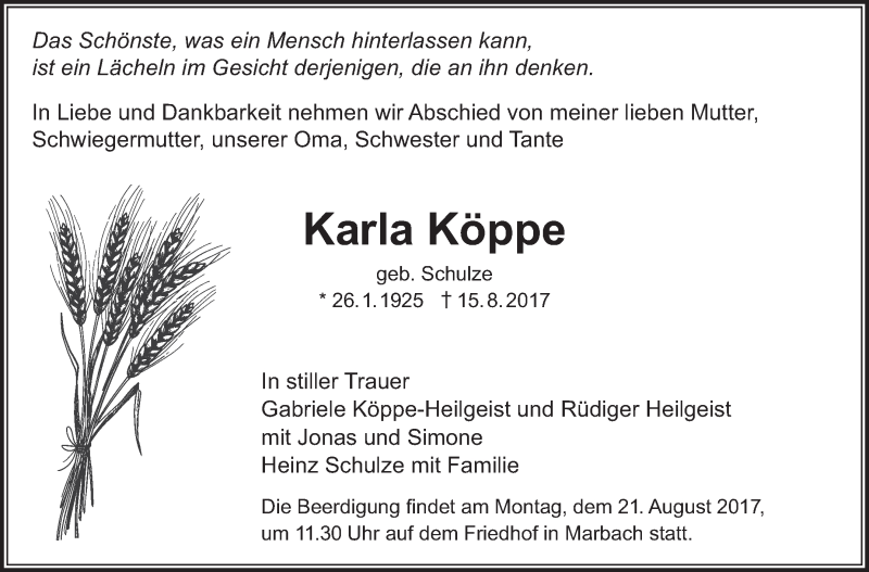 Hier finden Sie alle Traueranzeigen aus der Zeitung, die bisher für Karla Köppe erschienen sind. Weitere Traueranzeigen, die in der Zeitung erscheinen, werden hier ebenfalls aufgelistet