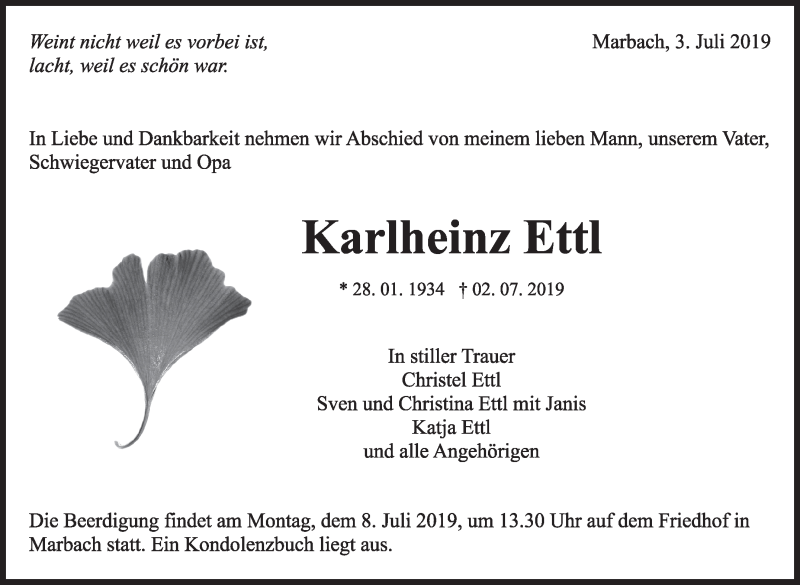 Hier finden Sie alle Traueranzeigen aus der Zeitung, die bisher für Karlheinz Ettl erschienen sind. Weitere Traueranzeigen, die in der Zeitung erscheinen, werden hier ebenfalls aufgelistet