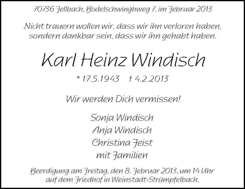 Hier finden Sie alle Traueranzeigen aus der Zeitung, die bisher für Karl Heinz Windisch erschienen sind. Weitere Traueranzeigen, die in der Zeitung erscheinen, werden hier ebenfalls aufgelistet