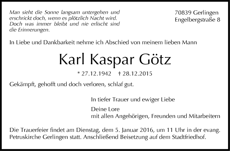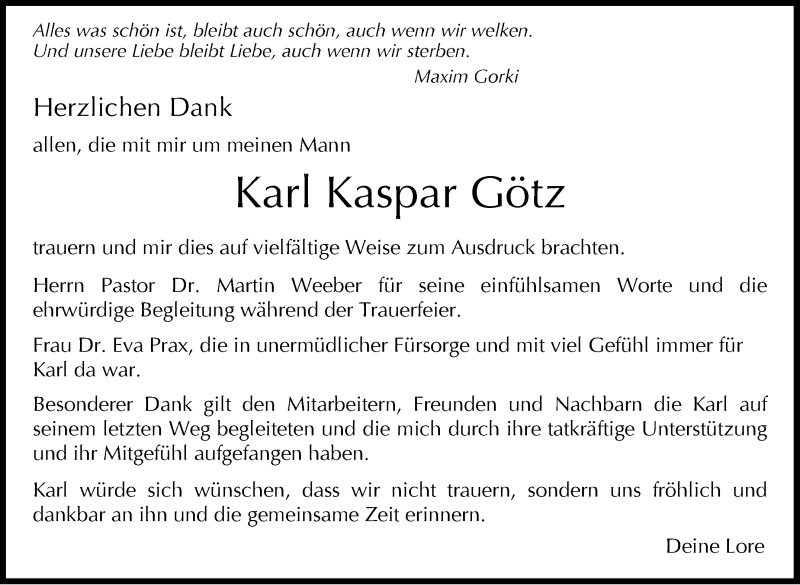 Hier finden Sie alle Traueranzeigen aus der Zeitung, die bisher für Karl Kaspar Götz erschienen sind. Weitere Traueranzeigen, die in der Zeitung erscheinen, werden hier ebenfalls aufgelistet