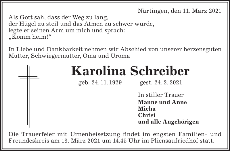 Hier finden Sie alle Traueranzeigen aus der Zeitung, die bisher für Karolina Schreiber erschienen sind. Weitere Traueranzeigen, die in der Zeitung erscheinen, werden hier ebenfalls aufgelistet