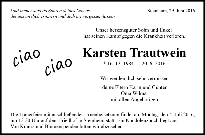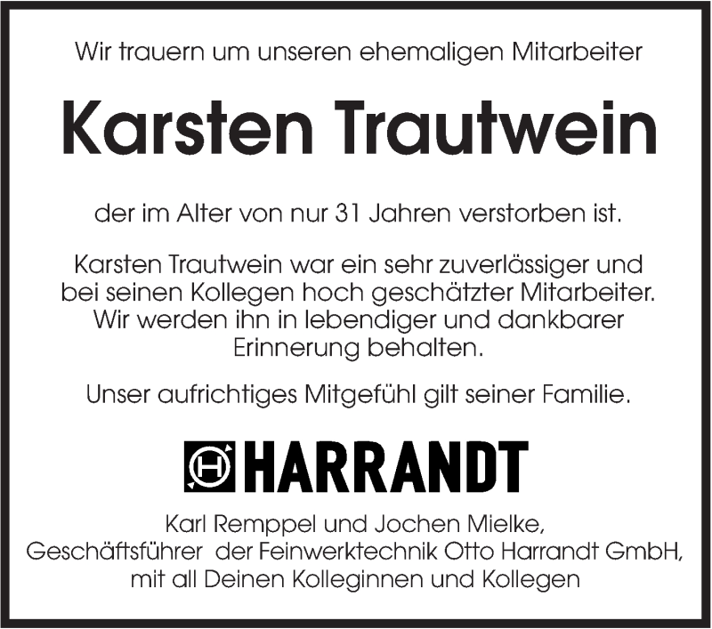 Hier finden Sie alle Traueranzeigen aus der Zeitung, die bisher für Karsten Trautwein erschienen sind. Weitere Traueranzeigen, die in der Zeitung erscheinen, werden hier ebenfalls aufgelistet