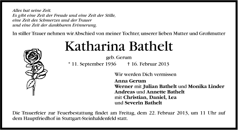 Hier finden Sie alle Traueranzeigen aus der Zeitung, die bisher für Katharina Bathelt erschienen sind. Weitere Traueranzeigen, die in der Zeitung erscheinen, werden hier ebenfalls aufgelistet