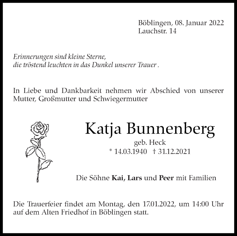 Hier finden Sie alle Traueranzeigen aus der Zeitung, die bisher für Katja Bunnenberg erschienen sind. Weitere Traueranzeigen, die in der Zeitung erscheinen, werden hier ebenfalls aufgelistet