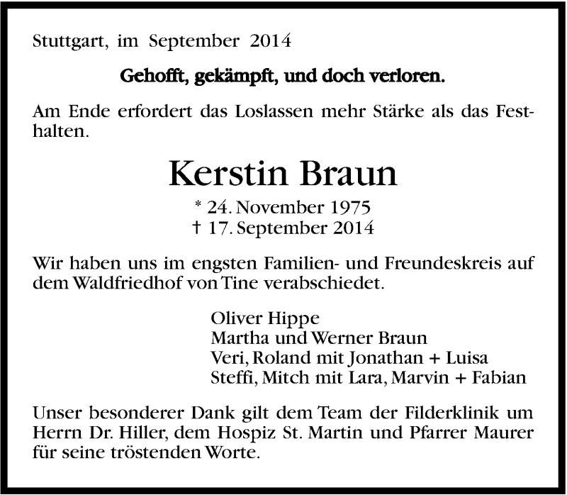 Hier finden Sie alle Traueranzeigen aus der Zeitung, die bisher für Kerstin Braun erschienen sind. Weitere Traueranzeigen, die in der Zeitung erscheinen, werden hier ebenfalls aufgelistet