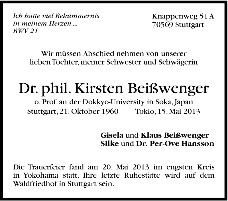 Hier finden Sie alle Traueranzeigen aus der Zeitung, die bisher für Kirsten Beißwenger erschienen sind. Weitere Traueranzeigen, die in der Zeitung erscheinen, werden hier ebenfalls aufgelistet