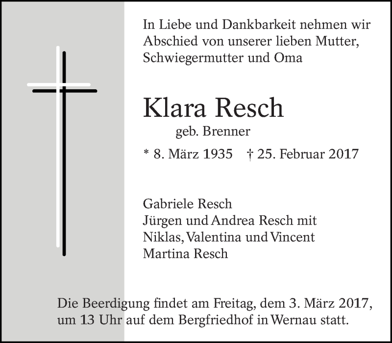 Hier finden Sie alle Traueranzeigen aus der Zeitung, die bisher für Klara Resch erschienen sind. Weitere Traueranzeigen, die in der Zeitung erscheinen, werden hier ebenfalls aufgelistet