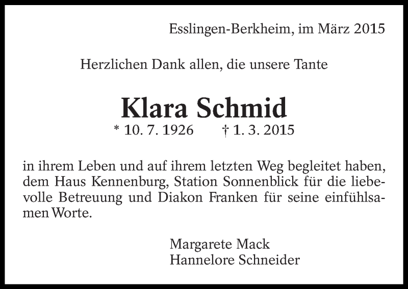 Hier finden Sie alle Traueranzeigen aus der Zeitung, die bisher für Klara Schmid erschienen sind. Weitere Traueranzeigen, die in der Zeitung erscheinen, werden hier ebenfalls aufgelistet