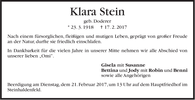 Hier finden Sie alle Traueranzeigen aus der Zeitung, die bisher für Klara Stein erschienen sind. Weitere Traueranzeigen, die in der Zeitung erscheinen, werden hier ebenfalls aufgelistet