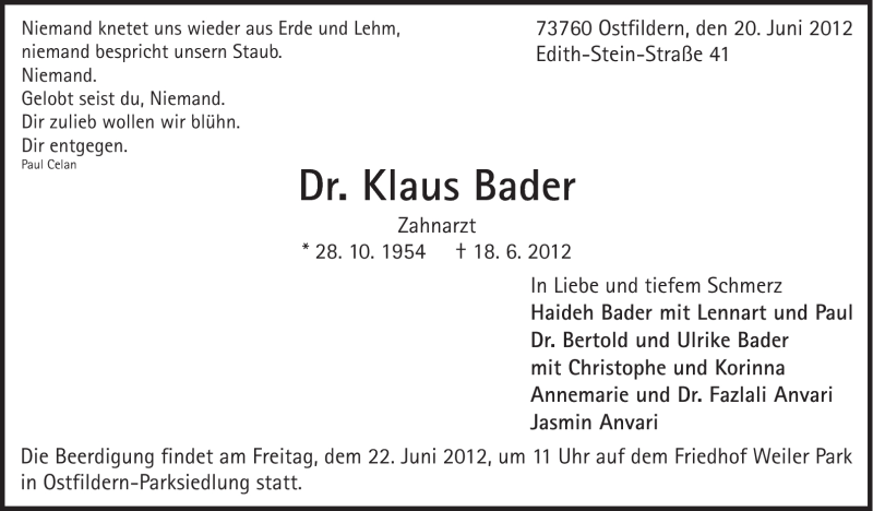 Hier finden Sie alle Traueranzeigen aus der Zeitung, die bisher für Klaus Bader erschienen sind. Weitere Traueranzeigen, die in der Zeitung erscheinen, werden hier ebenfalls aufgelistet