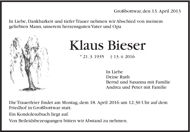 Hier finden Sie alle Traueranzeigen aus der Zeitung, die bisher für Klaus Bieser erschienen sind. Weitere Traueranzeigen, die in der Zeitung erscheinen, werden hier ebenfalls aufgelistet