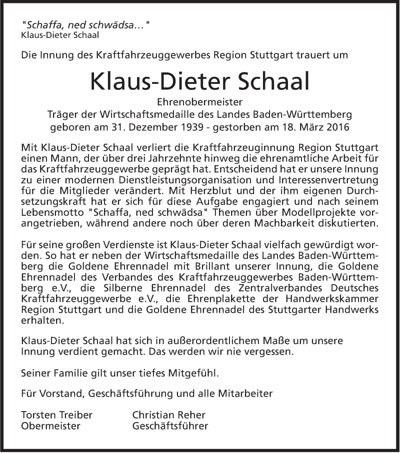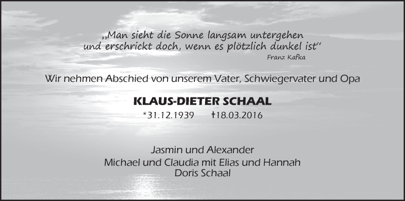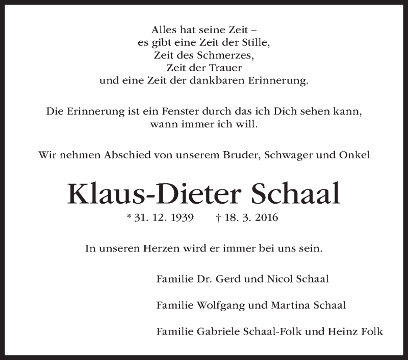 Hier finden Sie alle Traueranzeigen aus der Zeitung, die bisher für Klaus-Dieter Schaal erschienen sind. Weitere Traueranzeigen, die in der Zeitung erscheinen, werden hier ebenfalls aufgelistet