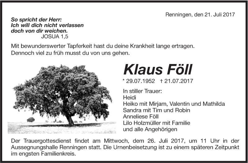 Hier finden Sie alle Traueranzeigen aus der Zeitung, die bisher für Klaus Föll erschienen sind. Weitere Traueranzeigen, die in der Zeitung erscheinen, werden hier ebenfalls aufgelistet
