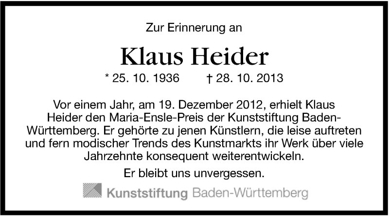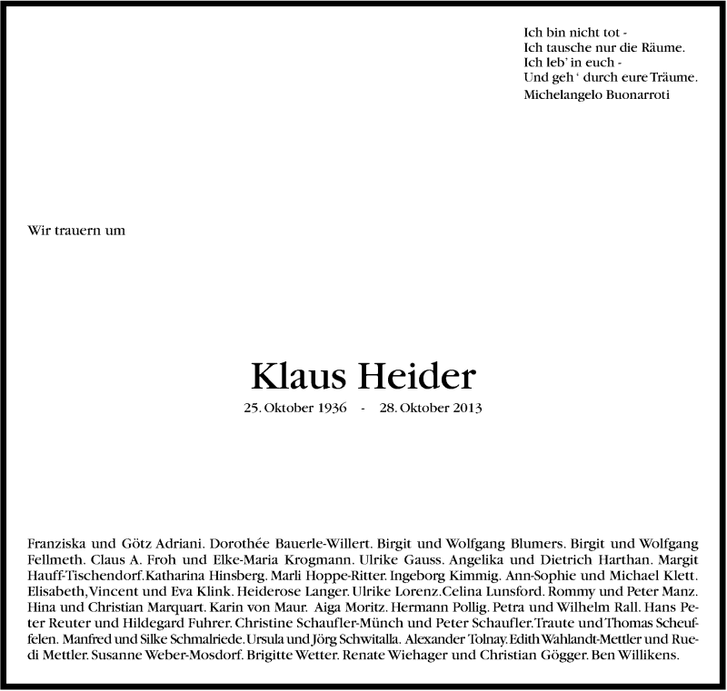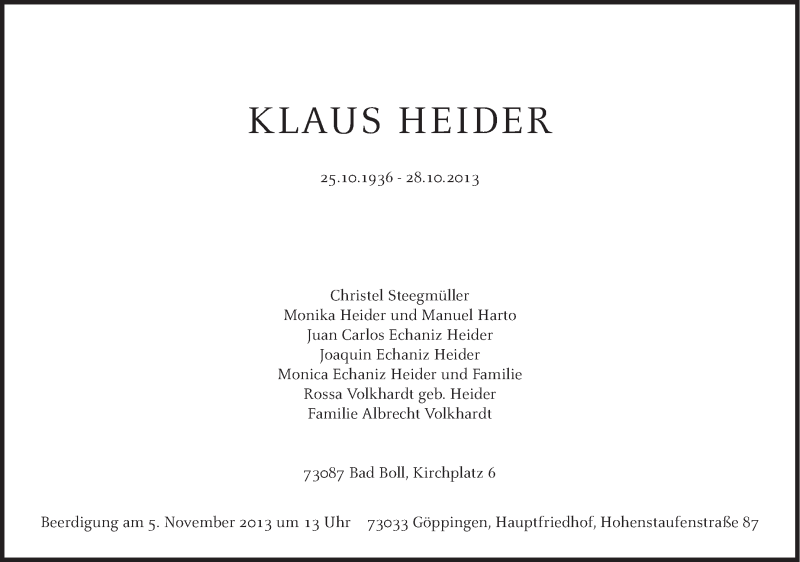 Hier finden Sie alle Traueranzeigen aus der Zeitung, die bisher für Klaus Heider erschienen sind. Weitere Traueranzeigen, die in der Zeitung erscheinen, werden hier ebenfalls aufgelistet