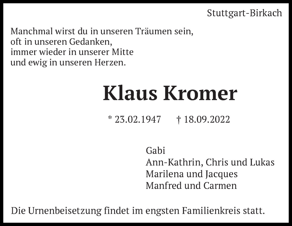 Hier finden Sie alle Traueranzeigen aus der Zeitung, die bisher für Klaus Kromer erschienen sind. Weitere Traueranzeigen, die in der Zeitung erscheinen, werden hier ebenfalls aufgelistet
