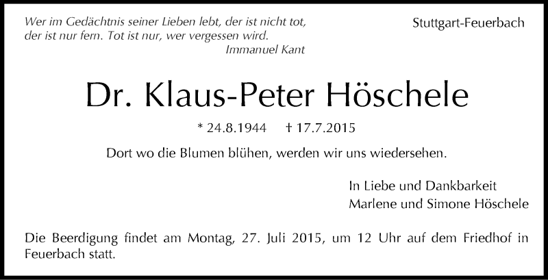 Hier finden Sie alle Traueranzeigen aus der Zeitung, die bisher für Klaus-Peter Höschele erschienen sind. Weitere Traueranzeigen, die in der Zeitung erscheinen, werden hier ebenfalls aufgelistet
