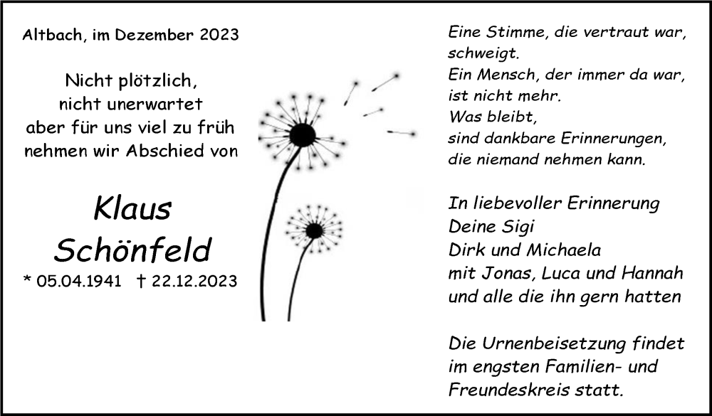 Hier finden Sie alle Traueranzeigen aus der Zeitung, die bisher für Klaus Schönfeld erschienen sind. Weitere Traueranzeigen, die in der Zeitung erscheinen, werden hier ebenfalls aufgelistet