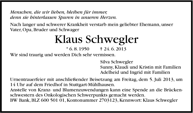 Hier finden Sie alle Traueranzeigen aus der Zeitung, die bisher für Klaus Schwegler erschienen sind. Weitere Traueranzeigen, die in der Zeitung erscheinen, werden hier ebenfalls aufgelistet