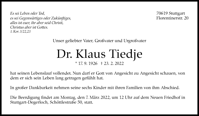 Hier finden Sie alle Traueranzeigen aus der Zeitung, die bisher für Klaus Tiedje erschienen sind. Weitere Traueranzeigen, die in der Zeitung erscheinen, werden hier ebenfalls aufgelistet