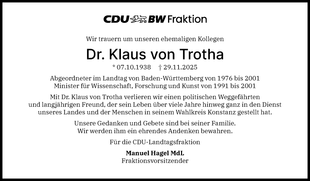 Hier finden Sie alle Traueranzeigen aus der Zeitung, die bisher für Klaus von Trotha erschienen sind. Weitere Traueranzeigen, die in der Zeitung erscheinen, werden hier ebenfalls aufgelistet