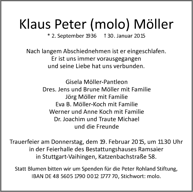 Hier finden Sie alle Traueranzeigen aus der Zeitung, die bisher für Klaus Peter Möller erschienen sind. Weitere Traueranzeigen, die in der Zeitung erscheinen, werden hier ebenfalls aufgelistet