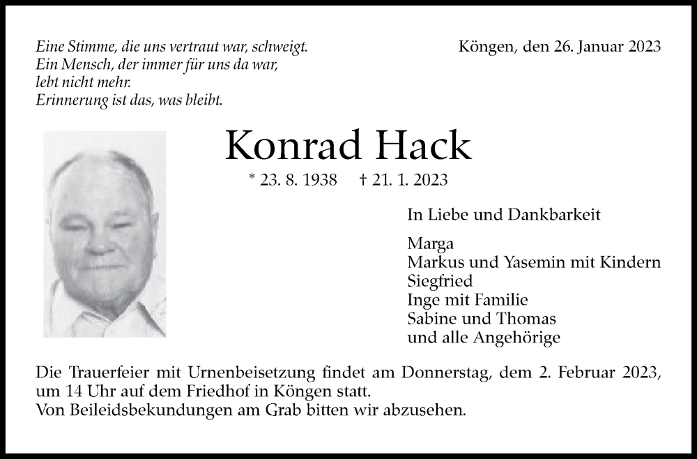 Hier finden Sie alle Traueranzeigen aus der Zeitung, die bisher für Konrad Hack erschienen sind. Weitere Traueranzeigen, die in der Zeitung erscheinen, werden hier ebenfalls aufgelistet