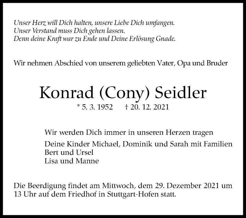 Hier finden Sie alle Traueranzeigen aus der Zeitung, die bisher für Konrad Seidler erschienen sind. Weitere Traueranzeigen, die in der Zeitung erscheinen, werden hier ebenfalls aufgelistet