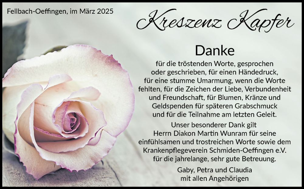 Hier finden Sie alle Traueranzeigen aus der Zeitung, die bisher für Kreszenz Kapfer erschienen sind. Weitere Traueranzeigen, die in der Zeitung erscheinen, werden hier ebenfalls aufgelistet