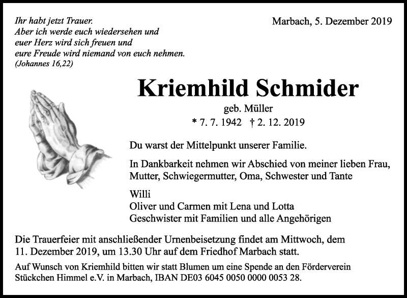 Hier finden Sie alle Traueranzeigen aus der Zeitung, die bisher für Kriemhild Schmider erschienen sind. Weitere Traueranzeigen, die in der Zeitung erscheinen, werden hier ebenfalls aufgelistet