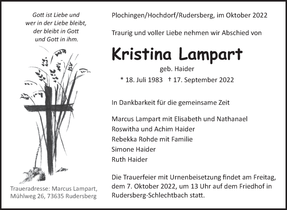 Hier finden Sie alle Traueranzeigen aus der Zeitung, die bisher für Kristina Lampart erschienen sind. Weitere Traueranzeigen, die in der Zeitung erscheinen, werden hier ebenfalls aufgelistet