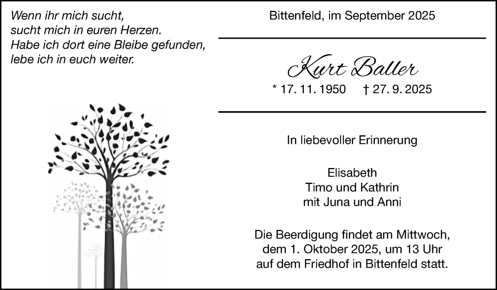 Hier finden Sie alle Traueranzeigen aus der Zeitung, die bisher für Kurt Baller erschienen sind. Weitere Traueranzeigen, die in der Zeitung erscheinen, werden hier ebenfalls aufgelistet
