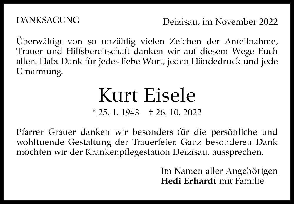 Hier finden Sie alle Traueranzeigen aus der Zeitung, die bisher für Kurt Eisele erschienen sind. Weitere Traueranzeigen, die in der Zeitung erscheinen, werden hier ebenfalls aufgelistet