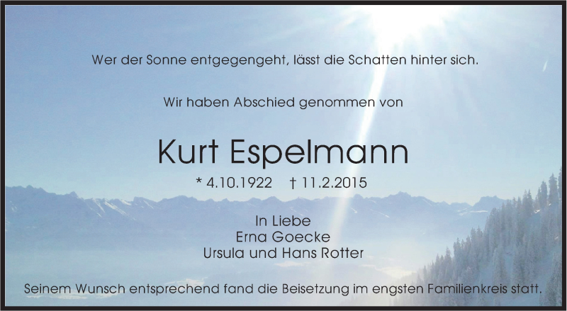 Hier finden Sie alle Traueranzeigen aus der Zeitung, die bisher für Kurt Espelmann erschienen sind. Weitere Traueranzeigen, die in der Zeitung erscheinen, werden hier ebenfalls aufgelistet
