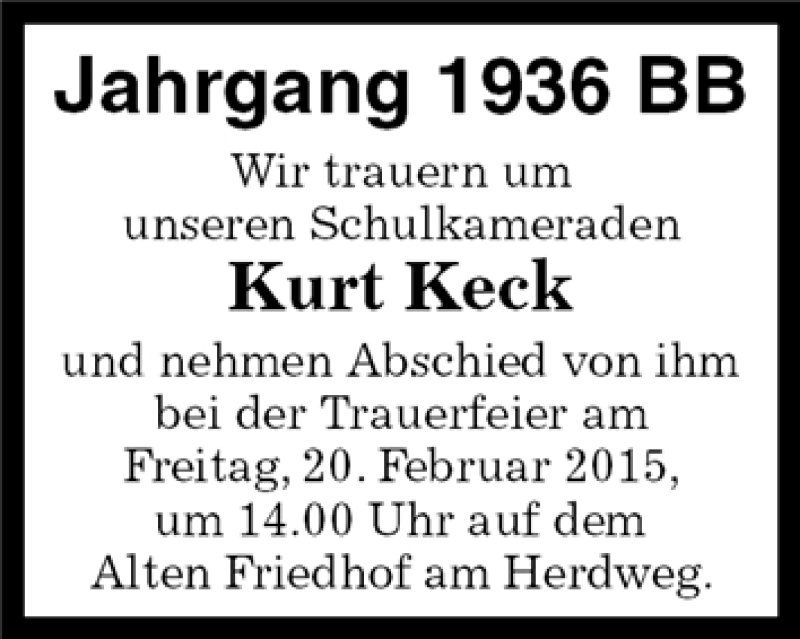 Hier finden Sie alle Traueranzeigen aus der Zeitung, die bisher für Kurt Keck erschienen sind. Weitere Traueranzeigen, die in der Zeitung erscheinen, werden hier ebenfalls aufgelistet