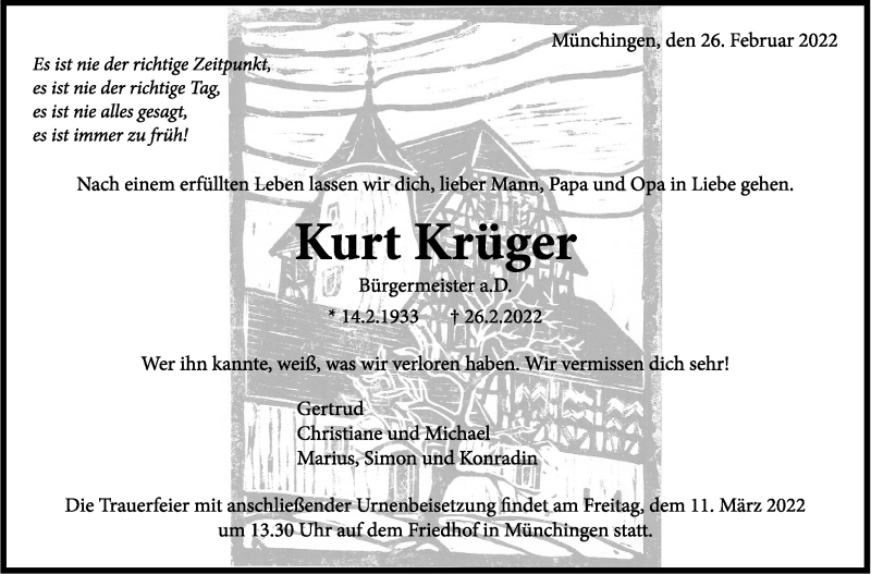 Hier finden Sie alle Traueranzeigen aus der Zeitung, die bisher für Kurt Krüger erschienen sind. Weitere Traueranzeigen, die in der Zeitung erscheinen, werden hier ebenfalls aufgelistet