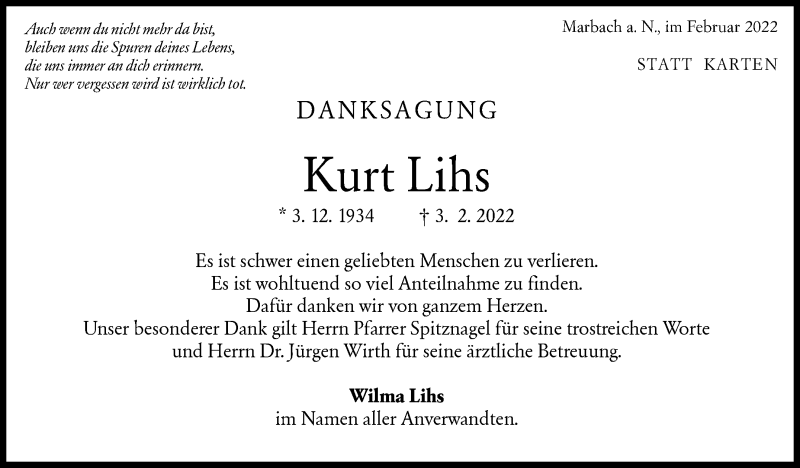 Hier finden Sie alle Traueranzeigen aus der Zeitung, die bisher für Kurt Lihs erschienen sind. Weitere Traueranzeigen, die in der Zeitung erscheinen, werden hier ebenfalls aufgelistet