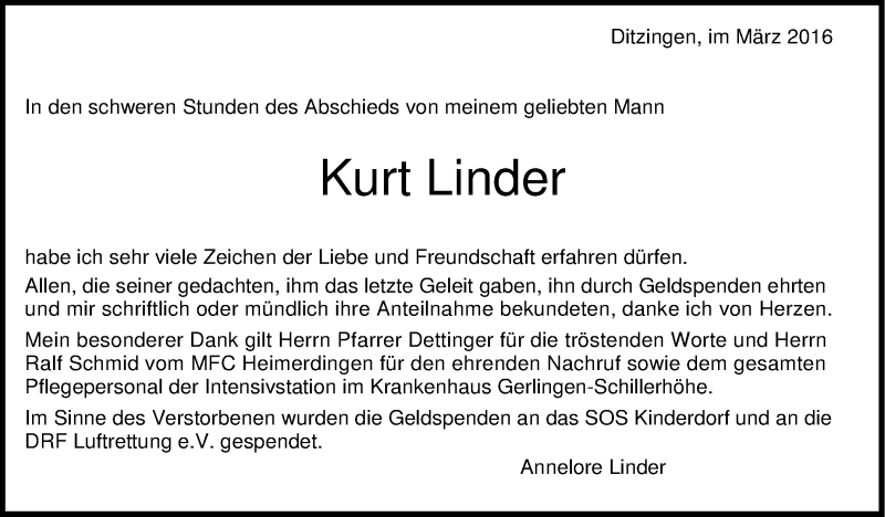 Hier finden Sie alle Traueranzeigen aus der Zeitung, die bisher für Kurt Linder erschienen sind. Weitere Traueranzeigen, die in der Zeitung erscheinen, werden hier ebenfalls aufgelistet