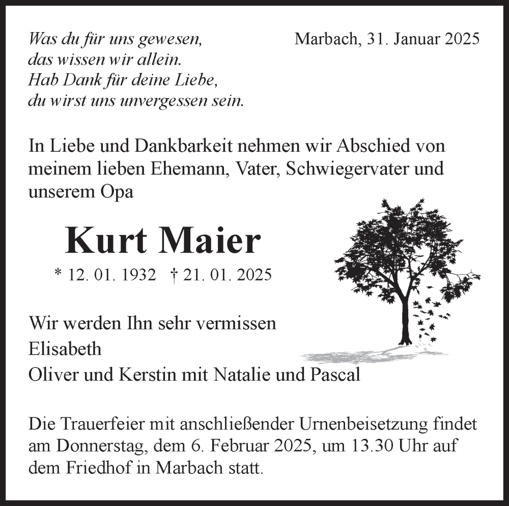 Hier finden Sie alle Traueranzeigen aus der Zeitung, die bisher für Kurt Maier erschienen sind. Weitere Traueranzeigen, die in der Zeitung erscheinen, werden hier ebenfalls aufgelistet