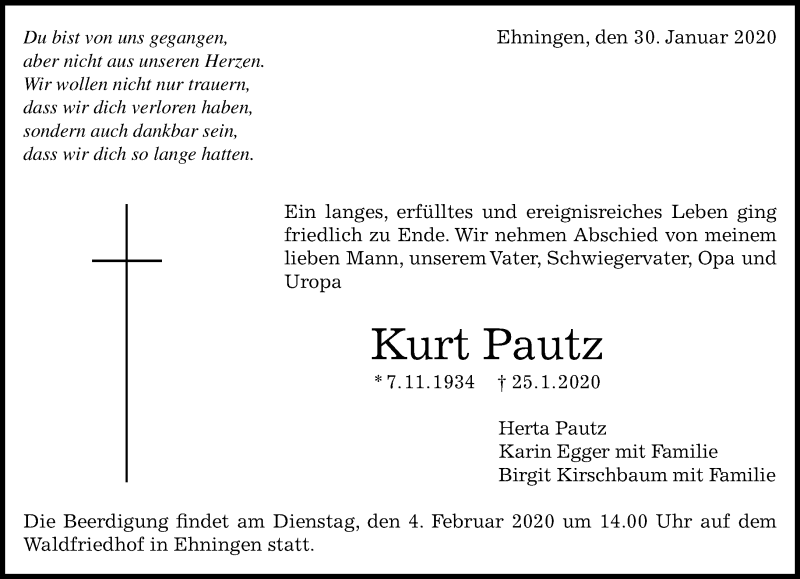Hier finden Sie alle Traueranzeigen aus der Zeitung, die bisher für Kurt Pautz erschienen sind. Weitere Traueranzeigen, die in der Zeitung erscheinen, werden hier ebenfalls aufgelistet