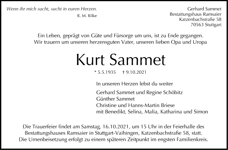 Hier finden Sie alle Traueranzeigen aus der Zeitung, die bisher für Kurt Sammet erschienen sind. Weitere Traueranzeigen, die in der Zeitung erscheinen, werden hier ebenfalls aufgelistet