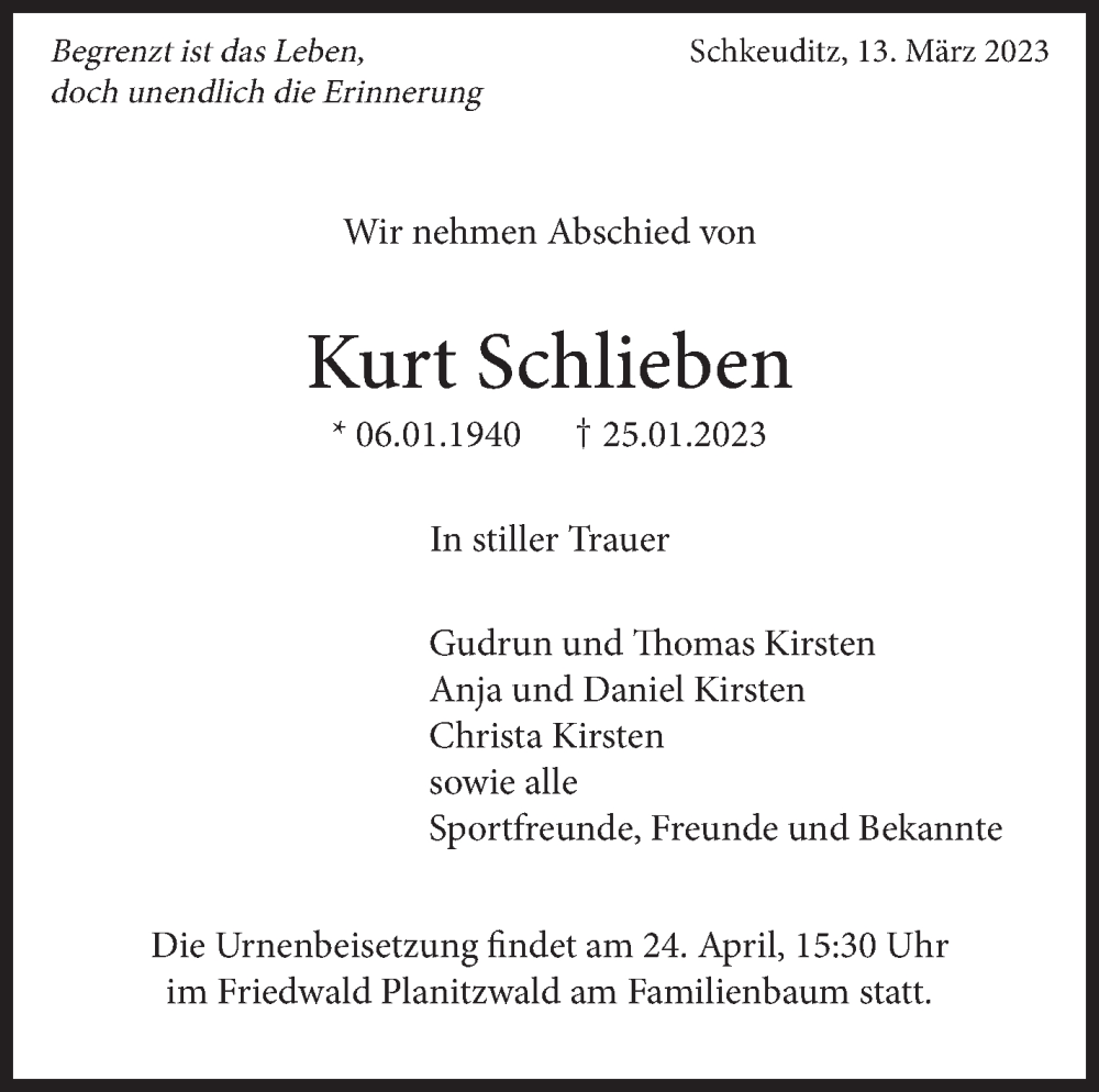 Hier finden Sie alle Traueranzeigen aus der Zeitung, die bisher für Kurt Schlieben erschienen sind. Weitere Traueranzeigen, die in der Zeitung erscheinen, werden hier ebenfalls aufgelistet