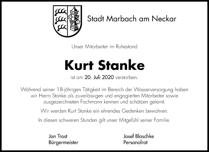 Hier finden Sie alle Traueranzeigen aus der Zeitung, die bisher für Kurt Stanke erschienen sind. Weitere Traueranzeigen, die in der Zeitung erscheinen, werden hier ebenfalls aufgelistet