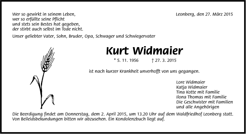 Hier finden Sie alle Traueranzeigen aus der Zeitung, die bisher für Kurt Widmaier erschienen sind. Weitere Traueranzeigen, die in der Zeitung erscheinen, werden hier ebenfalls aufgelistet