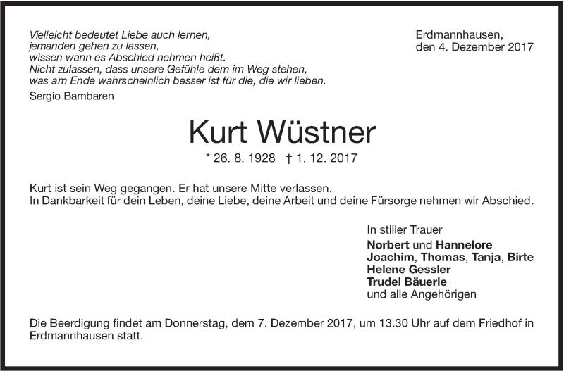 Hier finden Sie alle Traueranzeigen aus der Zeitung, die bisher für Kurt Wüstner erschienen sind. Weitere Traueranzeigen, die in der Zeitung erscheinen, werden hier ebenfalls aufgelistet