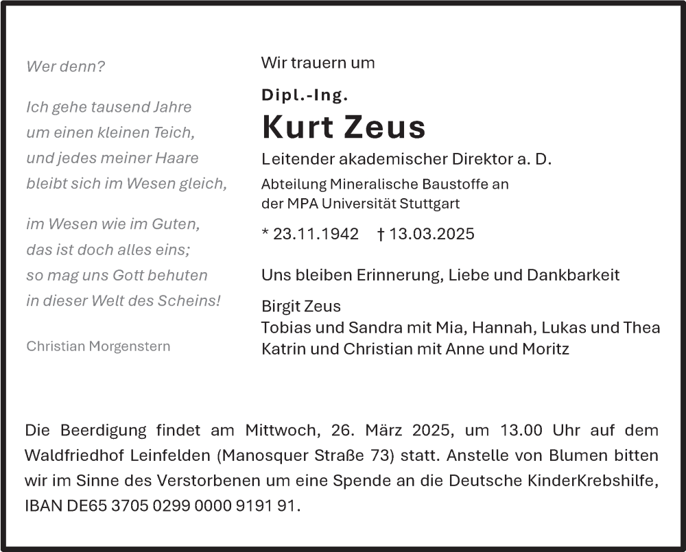 Hier finden Sie alle Traueranzeigen aus der Zeitung, die bisher für Kurt Zeus erschienen sind. Weitere Traueranzeigen, die in der Zeitung erscheinen, werden hier ebenfalls aufgelistet