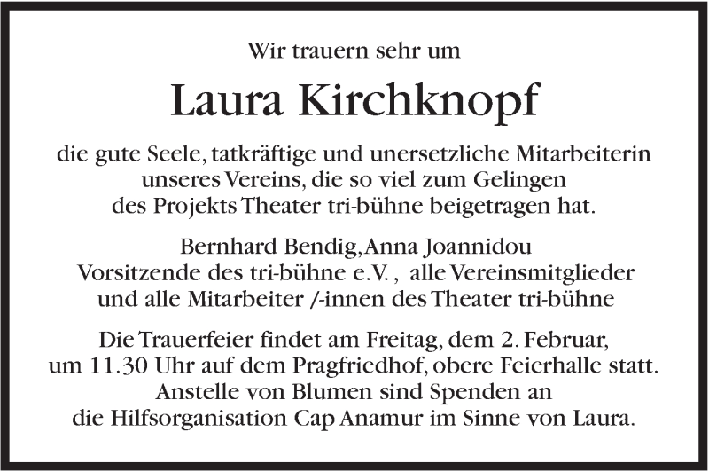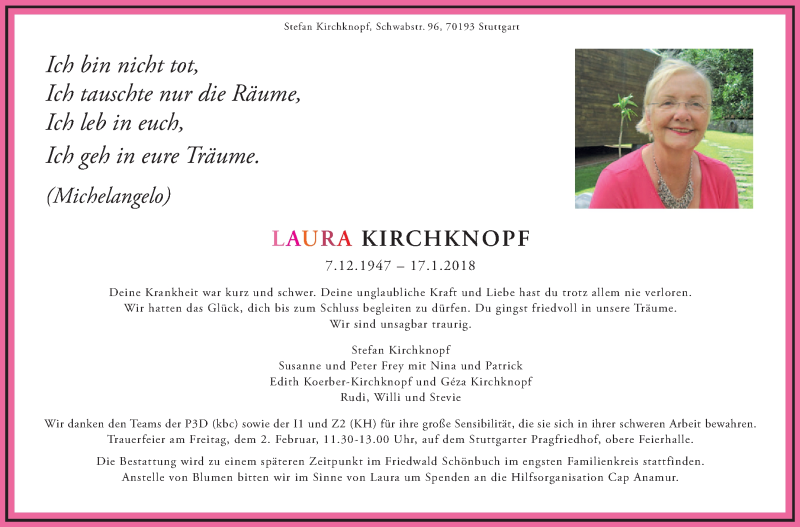 Hier finden Sie alle Traueranzeigen aus der Zeitung, die bisher für Laura Kirchknopf erschienen sind. Weitere Traueranzeigen, die in der Zeitung erscheinen, werden hier ebenfalls aufgelistet