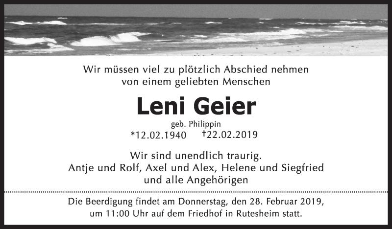 Hier finden Sie alle Traueranzeigen aus der Zeitung, die bisher für Leni Geier erschienen sind. Weitere Traueranzeigen, die in der Zeitung erscheinen, werden hier ebenfalls aufgelistet