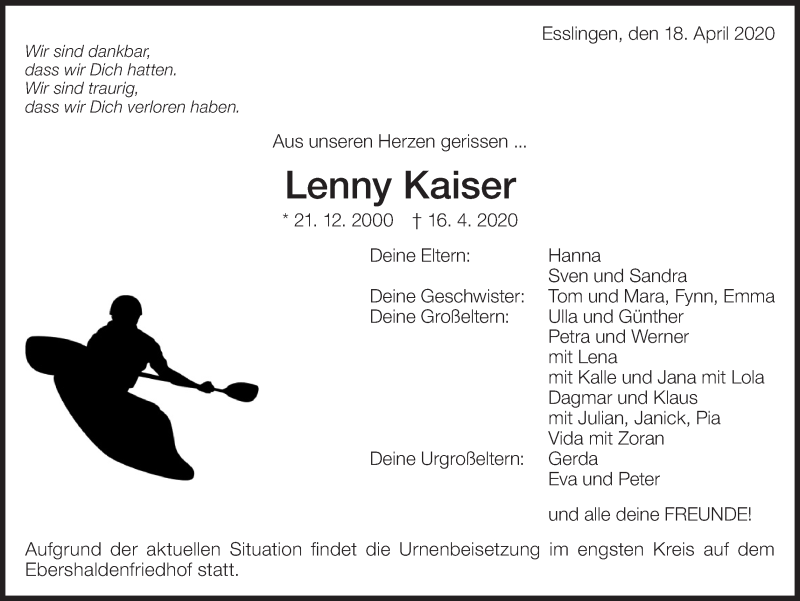 Hier finden Sie alle Traueranzeigen aus der Zeitung, die bisher für Lenny Kaiser erschienen sind. Weitere Traueranzeigen, die in der Zeitung erscheinen, werden hier ebenfalls aufgelistet