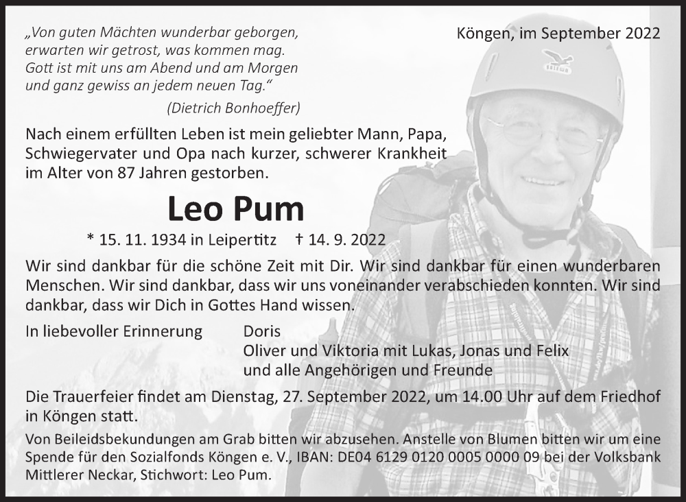 Hier finden Sie alle Traueranzeigen aus der Zeitung, die bisher für Leo Pum erschienen sind. Weitere Traueranzeigen, die in der Zeitung erscheinen, werden hier ebenfalls aufgelistet
